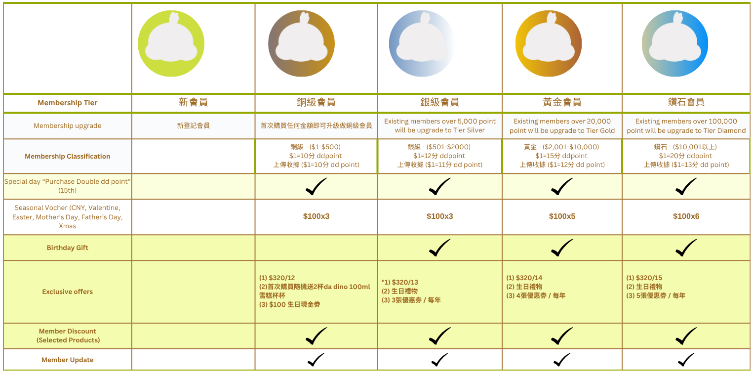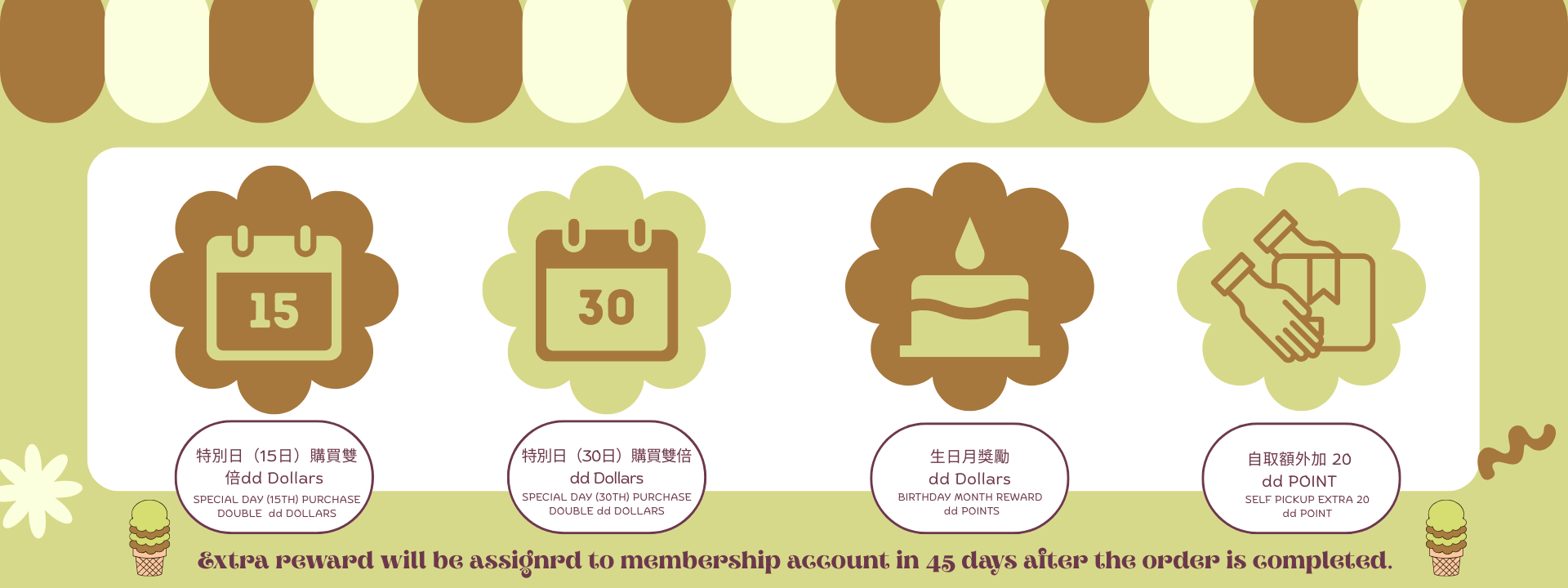 • 每次消費均盡可獲得累積會員積分 (dd point) 和商店購物金 (dd dollars) 2種奬賞